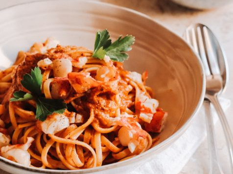 LOBSTER PASTA Préparation : 15 minutes Ingrédients pour 1 personne 1 (chair) homard canadien mi-cuit et décortiqué 115 g de spaghetti 150 ml de coulis de homard 50 g de tomates cerises coupées en 4 30 g de sauce tomates 3 g d’ail haché 5 g de piment haché 5 g de basilic haché Préparation Faites cuire les spaghettis dans de l'eau bouillante salée Faites revenir les tomates cerises dans une poêle avec l’ail et le piment Ajoutez le coulis et la sauce tomate et laissez réduire Égouttez les spaghettis et incorporez-les dans la sauce Versez l’huile d’olive et les feuilles de basilic Présentez avec le homard coupé en morceaux réguliers et revenu 2 minutes dans une poêle chaude avec un morceau de beurre (20 g). Auteur : Élodie Leneveu