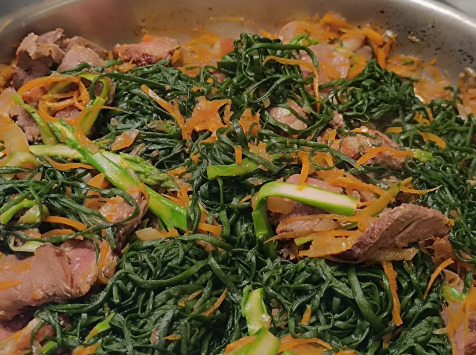 C'est en quelque sorte comme le haricot vert mais il vient de la mer ! Une fois bien rincée, il est prêt à être intégrer à vos préparations froides ou chaudes. Grâce à nos techniques de transformation japonaise et le fait que nous les récoltons très juvéniles, donc très fins, permet de les apprécier aussi crus, émincés comme de la ciboulette, pour être incorporés dans une salade ou dans une omelette et se consomme comme n'importe quel légume poêlé. Vous pouvez aussi essayer en duo avec des spaghettis (les vrais), soit en toute fin de cuisson, dans l'eau de vos spaghettis, afin qu'ils montent en températures, puis égouttez, une noisette de beurre, c'est gagné ! duo de couleur, de goût et de texture. A la carbonara c'est une dinguerie aussi ! et avec un magret de canard aussi, bref avec ce que vous aimez.