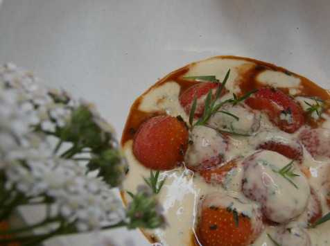 Fraises flambées au calvados, sauce au balsamique de pommes épicé Par Le Chef Benjamin Revel - La Musardière (27) Ingrédients (pour 2 personnes) • 20 fraises • 2 branches d’estragon frais • 2 cuillères à soupe de sucre • 30 g de beurre • 1 pincée de fleur de sel • 1 grosse cuillère à soupe de vinaigre balsamique de pomme de la Ferme du Gros Caillou • 20 cl de calvados • 1 yaourt fermier nature • 1 pincée de piment d’Espelette • 2 cuillères à soupe de vinaigre balsamique de pomme épicé de la Ferme du Gros Caillou • Préparation 1. Préparez les fraises • Équeutez les fraises et réservez-les entières. • Effeuillez les deux branches d’estragon et hachez finement les feuilles. 2. Faites le caramel et cuisez les fraises • Dans une poêle bien chaude, versez les 2 cuillères à soupe de sucre et réalisez un caramel à sec (ne remuez pas). • Lorsqu’il commence à brunir et à fumer légèrement, ajoutez immédiatement le beurre et la fleur de sel. • Une fois le mélange homogène, incorporez la cuillère de balsamique de pomme nature. • Ajoutez les fraises et enrobez-les bien dans le caramel. • Flamber ensuite avec le calvados. Une fois l’alcool évaporé, retirez les fraises du feu et réservez-les. 3. Préparez la sauce au yaourt • Dans un saladier, mélangez le yaourt fermier avec une pincée de piment d’Espelette, la moitié de l’estragon haché et les 2 cuillères à soupe de balsamique de pomme épicé. • Remuez jusqu’à obtention d’une sauce homogène. 4. Dressez et servez • Dans chaque assiette, disposez quelques fraises flambées. • Ajoutez un peu d’estragon frais par-dessus. • Nappez généreusement de sauce au yaourt. • Servez immédiatement, accompagné du reste de caramel dans une saucière à part.
