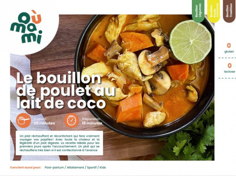 1. Détaillez l’oignon en petit, les cham pignons et les patates douces en la melles fines et mettez de côté. 2. Découpez l’escalope de poulet en pe tites lanières. Mettez de côté aussi. 3. Faites revenir l’oignon et le gingembre râpé avec un filet d’huile olive. 4. Ajoutez le concentré de tomates. 5. Quand les oignons deviennent translu cides, ajoutez les lanières de poulet. 6. Ajoutez la moitié des champignons et les épices sèches (curcuma, paprika, sel, poivre), et mélangez. Les tips de la Mama ! 7. Ajoutez le bouillon de poulet, le reste des champignons et les patates douces. Laissez chauffer à feu moyen vif pendant 15/20 min. 8. Vérifiez la cuisson des patates douces en les piquant. Elles doivent être fon dantes, prolongez si elles sont trop fermes. 9. Versez le lait de coco, remuez, laissez sur feu doux encore 3 - 4 minutes. 10. Dressez 2 bols avec votre bouillon. 11. Pressez un demi citron sur chacune de vos assiettes. 12. Régalez-vous