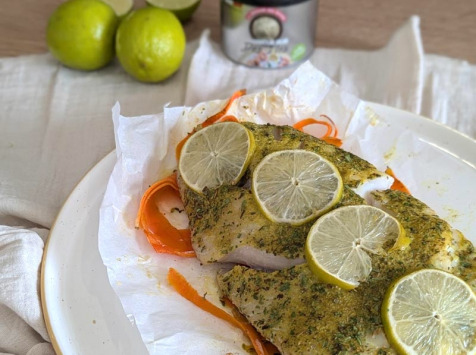 4. Coupez quelques tranches de citron vert et les ajouter sur le filet de poisson. Refermez la papillote.