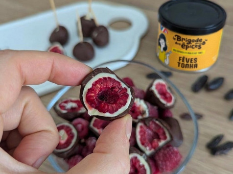 5. Sortez les framboises enrobées de chocolat blanc du congélateur et plongez-les une seconde fois dans le chocolat noir.
