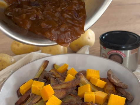 4. Lorsque les frites sont cuites, mettez les dans des bols, ajoutez les morceaux de cheddar préalablement coupés, puis nappez avec la sauce brune encore chaude. Il ne te reste plus qu’à te régaler.