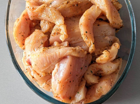 1. Découpez vos filets de volaille en fines lamelles comme des aiguillettes.