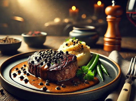 Dressez les steaks nappés de sauce au poivre avec une purée maison, des frites croustillantes ou des haricots verts croquants.